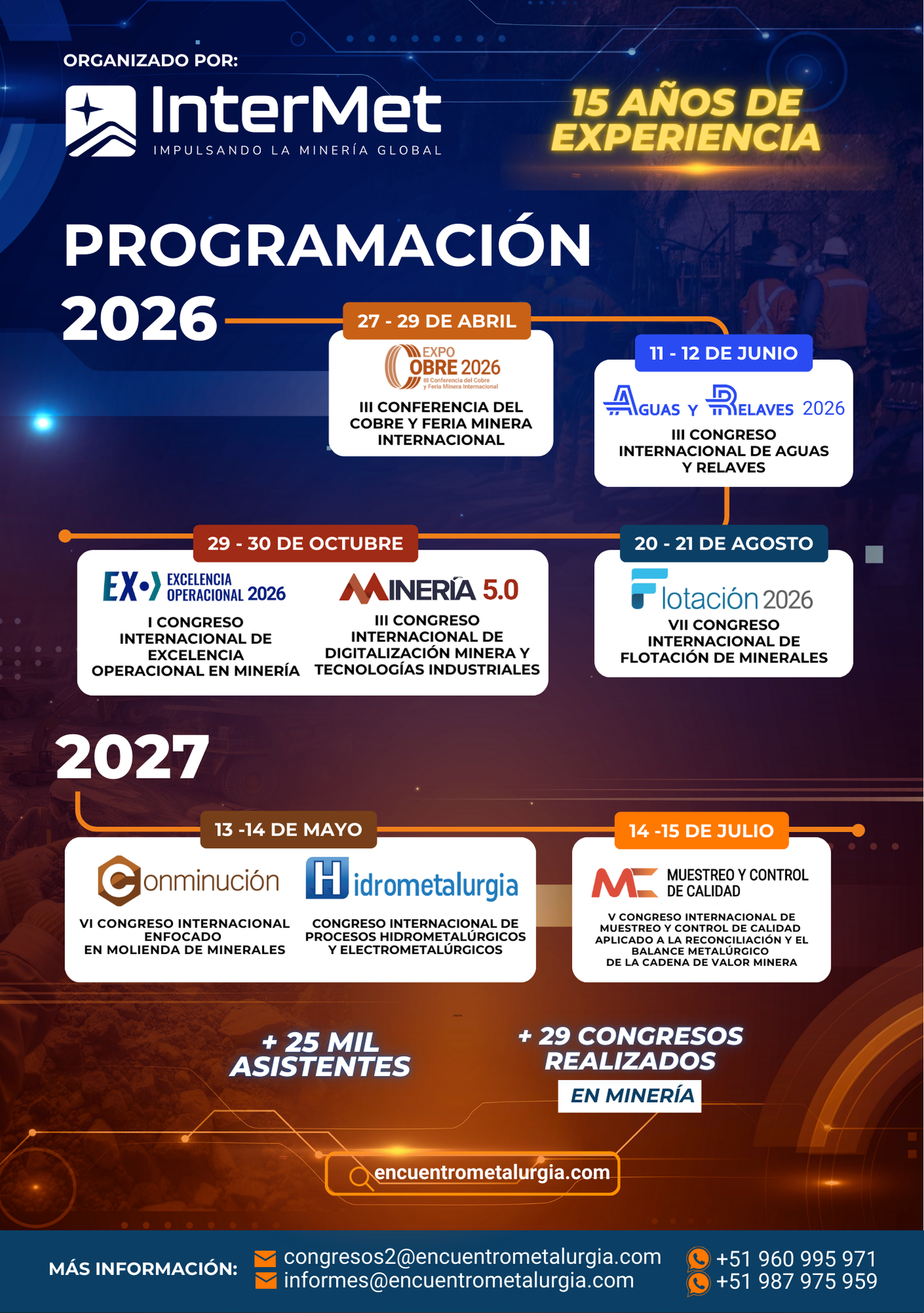 International Metallurgical Consultants S.A.C. (InterMet PERÚ), a leading Peruvian company in the training of metallurgical professionals and related engineering fields. InterMet has extensive experience in organizing Conferences and Congresses with Commercial Exhibitions and International, Academic, and Business Courses. It is a company committed to creating and generating business opportunities between suppliers and buyers from various industrial sectors in mining, through high-quality and efficient events for the promotion and launch of products and brands; thus ensuring that their participation is 100% dynamic and productive.
